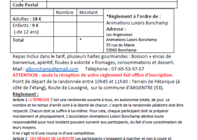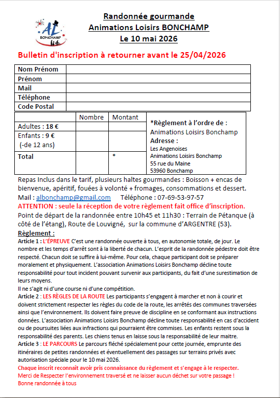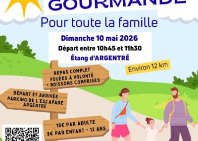 La  randonnée Gourmande a lieu le dimanche 10 mai 2026.  Nouveau circuit sur Argentré d’environ 12 kms avec haltes gourmandes. Chacun à son rythme